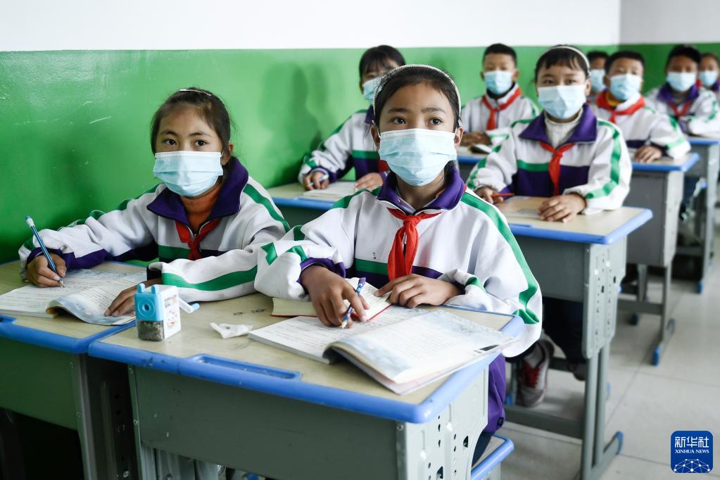 9月1日,在位于果洛藏族自治州瑪沁縣的瑪多地震災(zāi)后過渡安置一校區(qū),學(xué)生在上開學(xué)第一課。新華社記者 張龍 攝