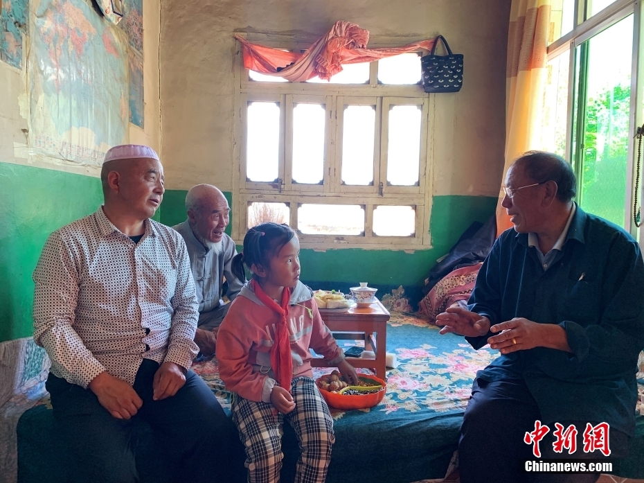 青海省海東市循化撒拉族自治縣白莊鎮(zhèn)來(lái)塘村一戶(hù)學(xué)生家,藏族教師完么仁增(右一)與學(xué)生家長(zhǎng)交流。中新社記者 馬銘言 攝
