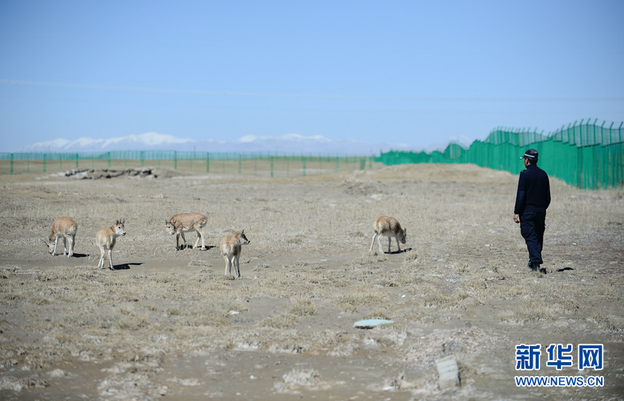 在可可西里國家級自然保護區(qū)索南達杰保護站,站長趙新錄與藏羚羊在一起(9月28日攝)。新華社記者 李占軼 攝