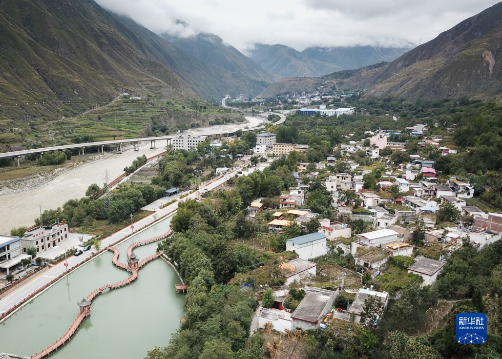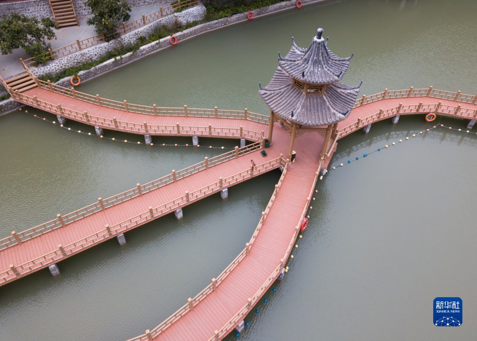這是10月13日在舟曲縣大川鎮(zhèn)土橋子村拍攝的田園觀光體里的水上步道(無(wú)人機(jī)照片)。新華社記者 馬希平 攝