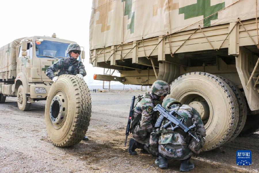 聯(lián)勤保障部隊汽車運輸某團一營一連參加高原駐訓時,在行車途中組織官兵進行防衛(wèi)演練(2020年6月16日攝)。新華社發(fā)