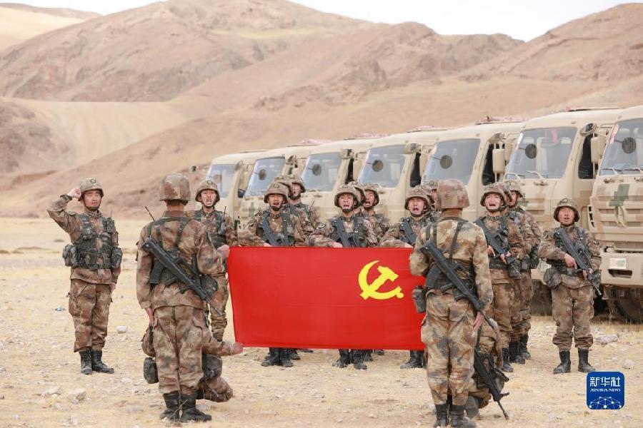 聯(lián)勤保障部隊汽車運輸某團一營一連在高原執(zhí)行運輸任務時,利用休息間隙組織官兵重溫入黨誓詞(5月10日攝)。新華社發(fā)