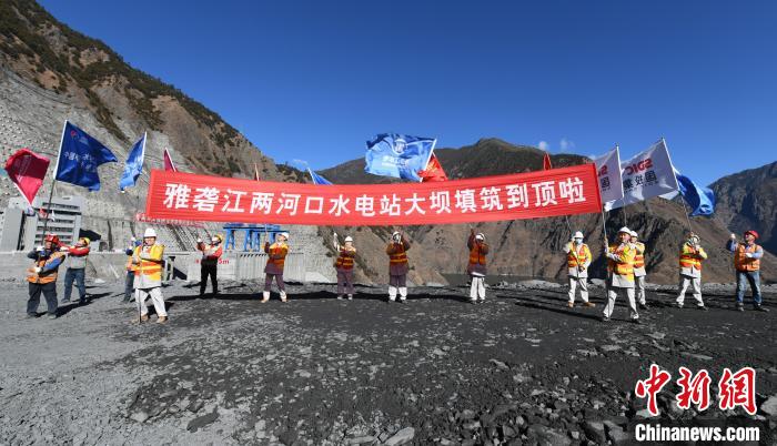 工人慶祝大壩填筑到頂。雅礱江公司供圖