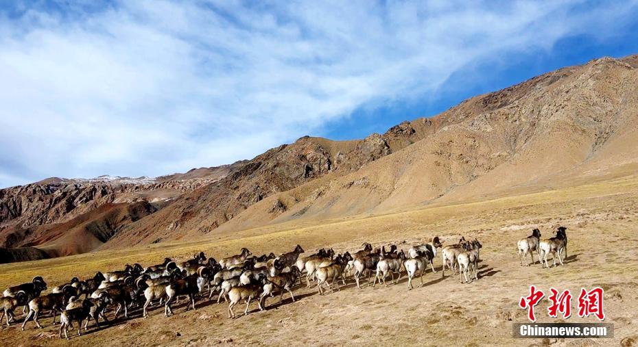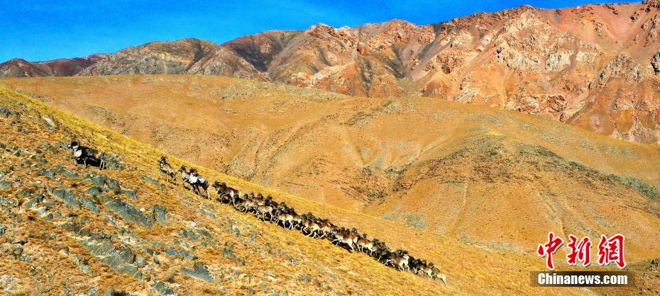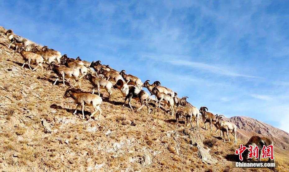 近日,攝影愛好者在地處柴達木盆地的青海省海西州都蘭縣香加鄉(xiāng)山區(qū)拍到成群盤羊。