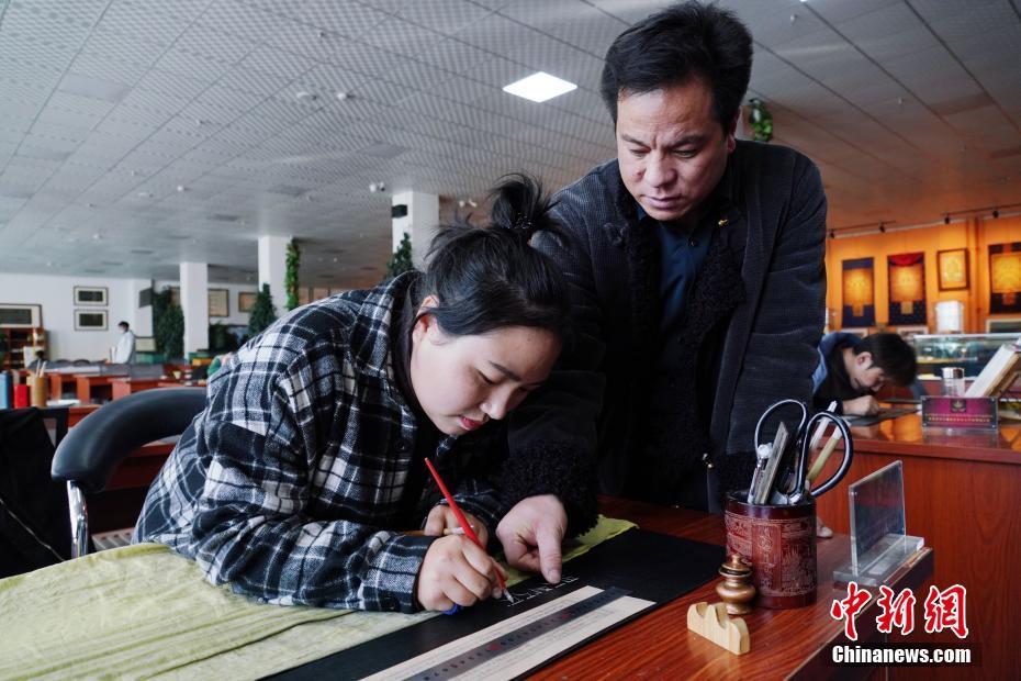 1月18日,青海省黃南藏族自治州尖扎縣非物質(zhì)文化遺產(chǎn)綜合傳習(xí)中心負(fù)責(zé)人才讓多杰(右)向?qū)W員講解經(jīng)文的書寫格式。該中心現(xiàn)有50名學(xué)員學(xué)習(xí)藏文書寫、唐卡繪制、藏紙手工制作技藝等。他們在學(xué)習(xí)、了解豐富多彩的藏族文化知識外,每年還可增收近5萬元人民幣。中新社記者 馬銘言 攝
