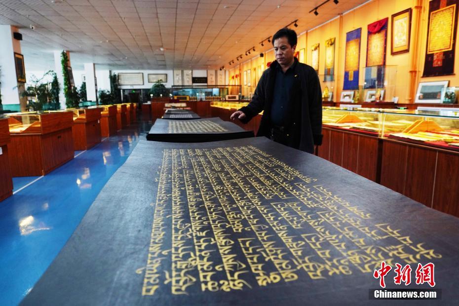 1月18日,青海省黃南藏族自治州尖扎縣非物質(zhì)文化遺產(chǎn)綜合傳習(xí)中心負(fù)責(zé)人才讓多杰介紹即將出售的經(jīng)書。該中心現(xiàn)有50名學(xué)員學(xué)習(xí)藏文書寫、唐卡繪制、藏紙手工制作技藝等。他們在學(xué)習(xí)、了解豐富多彩的藏族文化知識外,每年還可增收近5萬元人民幣。中新社記者 馬銘言 攝