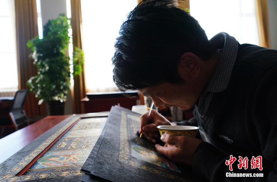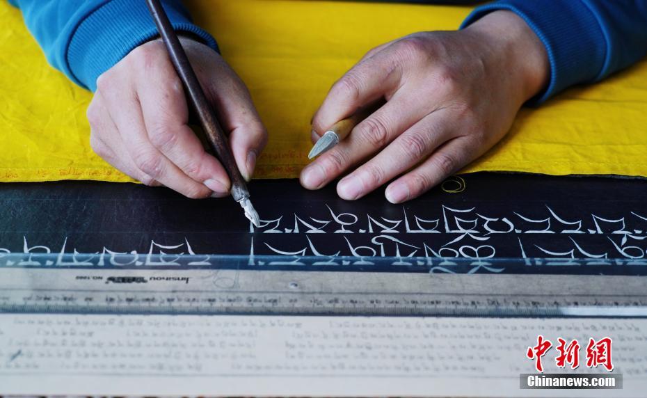 1月18日,青海省黃南藏族自治州尖扎縣非物質(zhì)文化遺產(chǎn)綜合傳習(xí)中心內(nèi),學(xué)員正在抄寫經(jīng)文。該中心現(xiàn)有50名學(xué)員學(xué)習(xí)藏文書寫、唐卡繪制、藏紙手工制作技藝等。他們在學(xué)習(xí)、了解豐富多彩的藏族文化知識外,每年還可增收近5萬元人民幣。中新社記者 馬銘言 攝