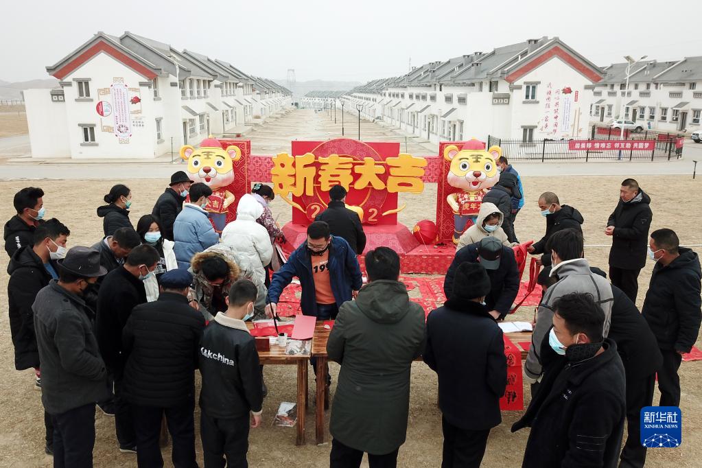 1月25日,在蘭州新區(qū)舟曲避險搬遷安置點,舟曲地質(zhì)災(zāi)害避險搬遷第一臨時黨支部組織書法家給搬遷群眾送春聯(lián)(無人機照片)。新華社記者 范培珅 攝