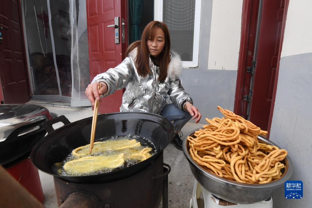 1月25日,在蘭州新區(qū)舟曲避險搬遷安置點,搬遷群眾制作美食。新華社記者 范培珅 攝