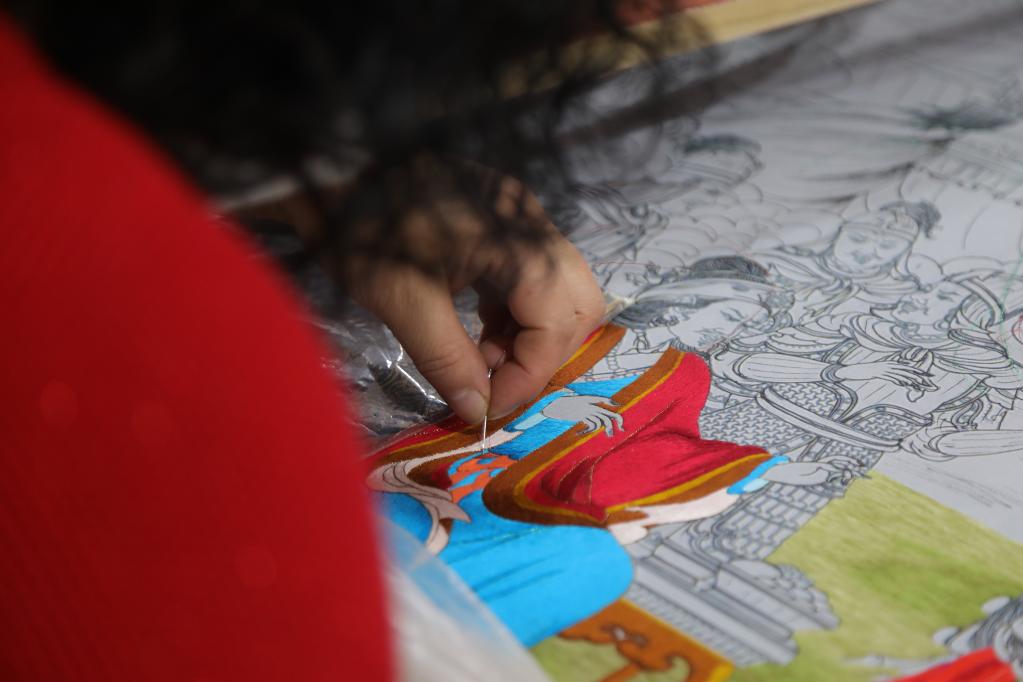 平滑的線條、細膩的針腳、傳統(tǒng)的繡法、新穎的設計……繡坊內(nèi),繡娘們聚精會神穿針引線,拉毛葉忠仔細檢查繡娘們的作品,用藏繡技藝講述格薩爾王的故事是一次創(chuàng)新。