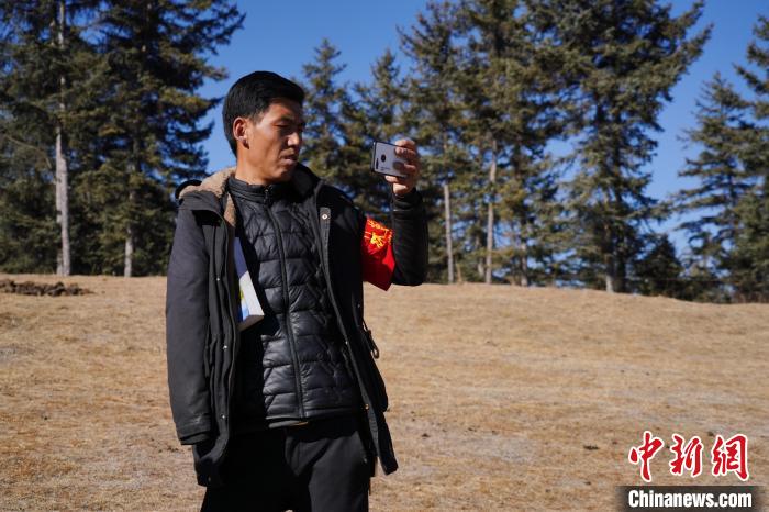 圖為桑杰加用手機(jī)記錄自己巡護(hù)的林場(chǎng)?!●R銘言 攝