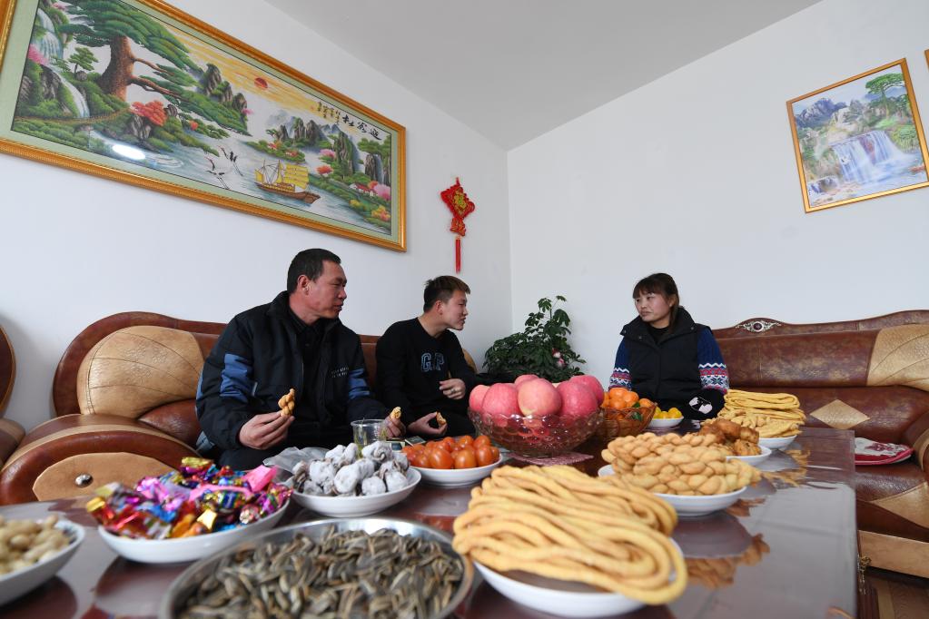 1月25日,在蘭州新區(qū)舟曲避險(xiǎn)搬遷安置點(diǎn),劉長(zhǎng)海(左)、寧蘭玉(右)和孩子一起在家中吃飯。新華社記者 范培珅 攝