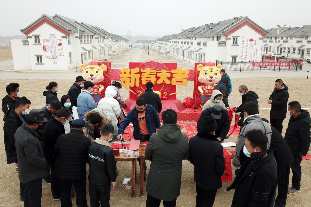 1月25日,在蘭州新區(qū)舟曲避險(xiǎn)搬遷安置點(diǎn),舟曲地質(zhì)災(zāi)害避險(xiǎn)搬遷第一臨時(shí)黨支部組織書(shū)法家給搬遷群眾送春聯(lián)。新華社記者 范培珅 攝