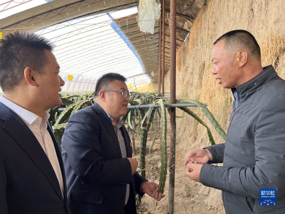 2月24日,郭存海(右)向銀行工作人員介紹火龍果生長情況。新華社記者 解統(tǒng)強(qiáng) 攝