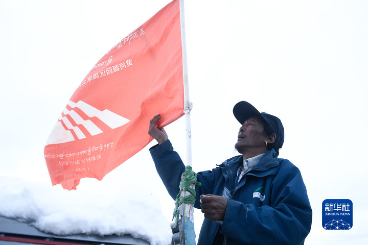 2021年10月20日,在青海省果洛藏族自治州瑪多縣扎陵湖鄉(xiāng)勒那村,三江源國家公園黃河源園區(qū)生態(tài)管護(hù)員安才在整理管護(hù)隊(duì)旗幟。新華社記者 張龍 攝