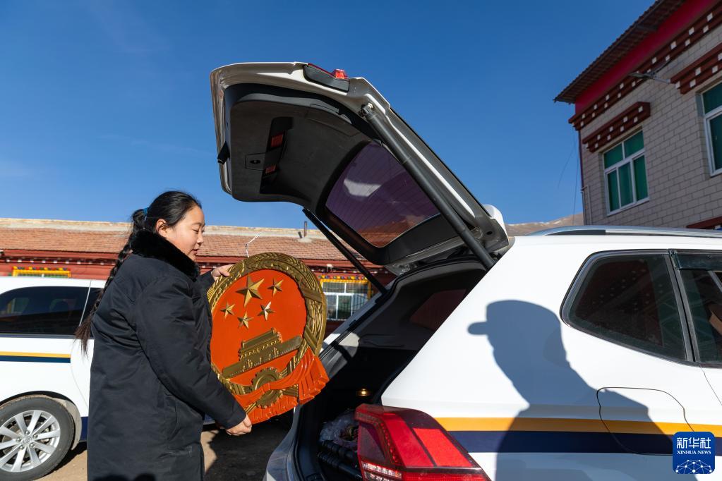 在石渠縣,“正義雪蓮”女子審判團(tuán)隊(duì)的成員將國徽裝到車?yán)?,?zhǔn)備前往距離縣城70公里的呷依鄉(xiāng),通過巡回審判開庭審理一起離婚案(1月10日攝)。 新華社記者 沈伯韓 攝