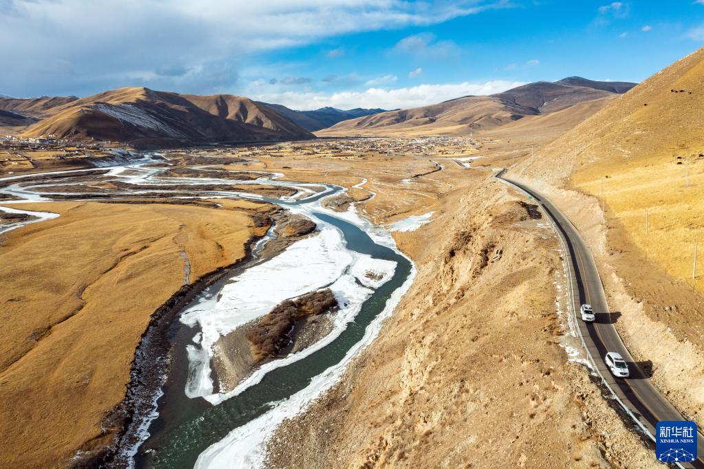 “正義雪蓮”女子審判團(tuán)隊(duì)成員乘車來到距離石渠縣城70公里的呷依鄉(xiāng),準(zhǔn)備通過巡回審判開庭審理一起離婚案(1月10日攝,無人機(jī)照片)。新華社記者 沈伯韓 攝