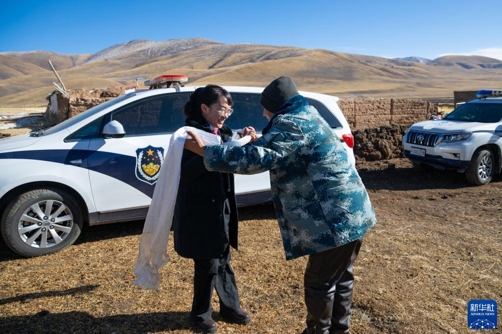 “正義雪蓮”女子審判團(tuán)隊(duì)成員乘車來到距離石渠縣城70公里的呷依鄉(xiāng),準(zhǔn)備通過巡回審判開庭審理一起離婚案。這是法官澤仁曲西(左)接受當(dāng)?shù)厝罕姭I(xiàn)上的哈達(dá)(1月10日攝)。新華社記者 沈伯韓 攝