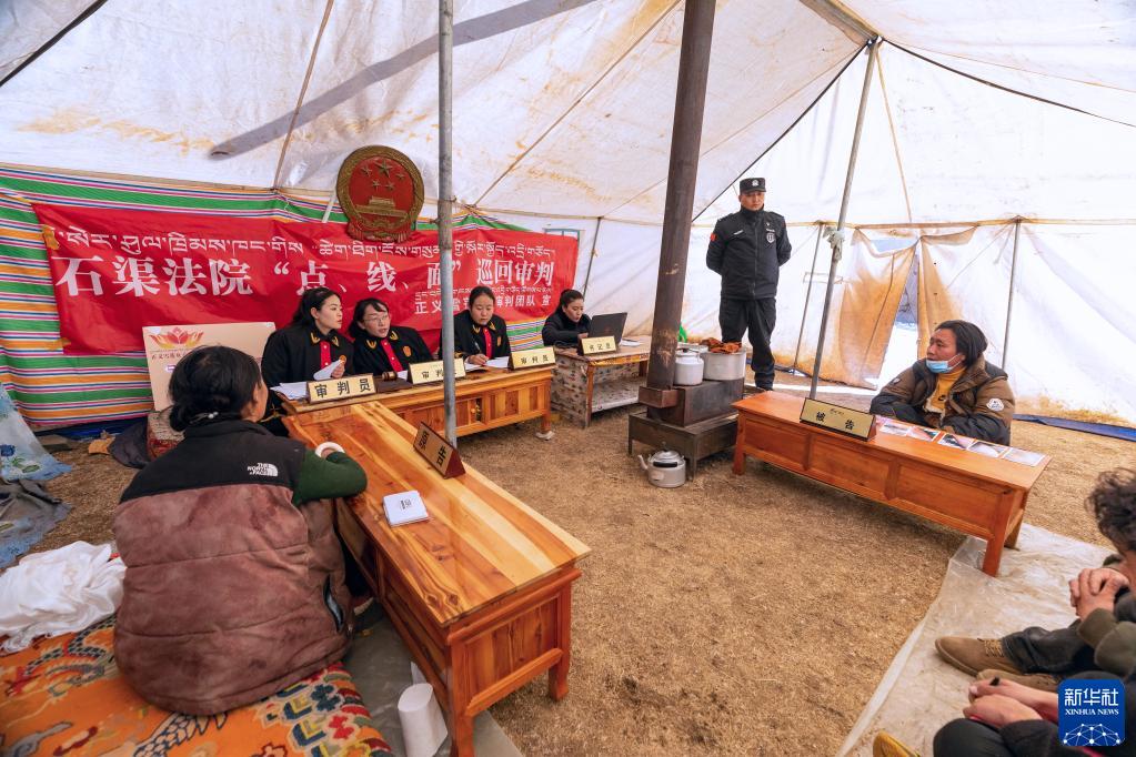 “正義雪蓮”女子審判團(tuán)隊(duì)成員乘車來到距離石渠縣城70公里的呷依鄉(xiāng),在一頂帳篷布置成的“帳篷法庭”里,法官澤仁曲西(中)帶領(lǐng)團(tuán)隊(duì),通過巡回審判開庭審理一起離婚案(1月10日攝)。新華社記者 沈伯韓 攝