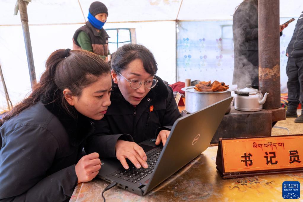 “正義雪蓮”女子審判團(tuán)隊(duì)成員乘車來到距離石渠縣城70公里的呷依鄉(xiāng),準(zhǔn)備通過巡回審判開庭審理一起離婚案。在一頂帳篷布置成的“帳篷法庭”里,法官澤仁曲西(前右)與同事為開庭做準(zhǔn)備(1月10日攝)。新華社記者 沈伯韓 攝