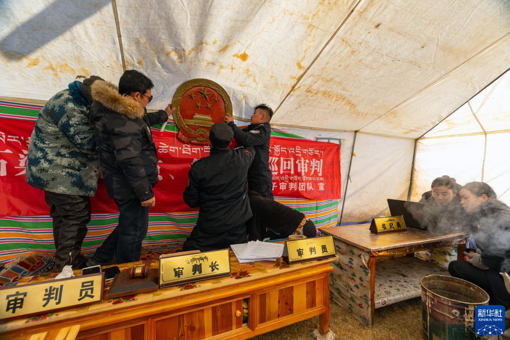 “正義雪蓮”女子審判團(tuán)隊(duì)成員乘車來到距離石渠縣城70公里的呷依鄉(xiāng),準(zhǔn)備通過巡回審判開庭審理一起離婚案。這是工作人員在當(dāng)事人家的一頂帳篷中布置“帳篷法庭”(1月10日攝)。新華社記者 沈伯韓 攝