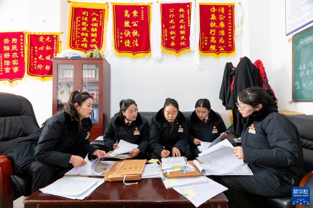 在石渠縣人民法院,法官澤仁曲西(右一)帶領(lǐng)“正義雪蓮”女子審判團(tuán)隊(duì)成員查閱案卷,討論案情(1月11日攝)。新華社記者 沈伯韓 攝