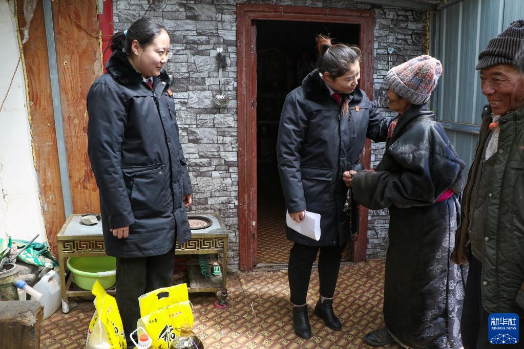 “正義雪蓮”女子審判團(tuán)隊(duì)成員到當(dāng)事人家中回訪,并為其送來米、油等生活用品(2021年4月14日攝)。新華社發(fā)