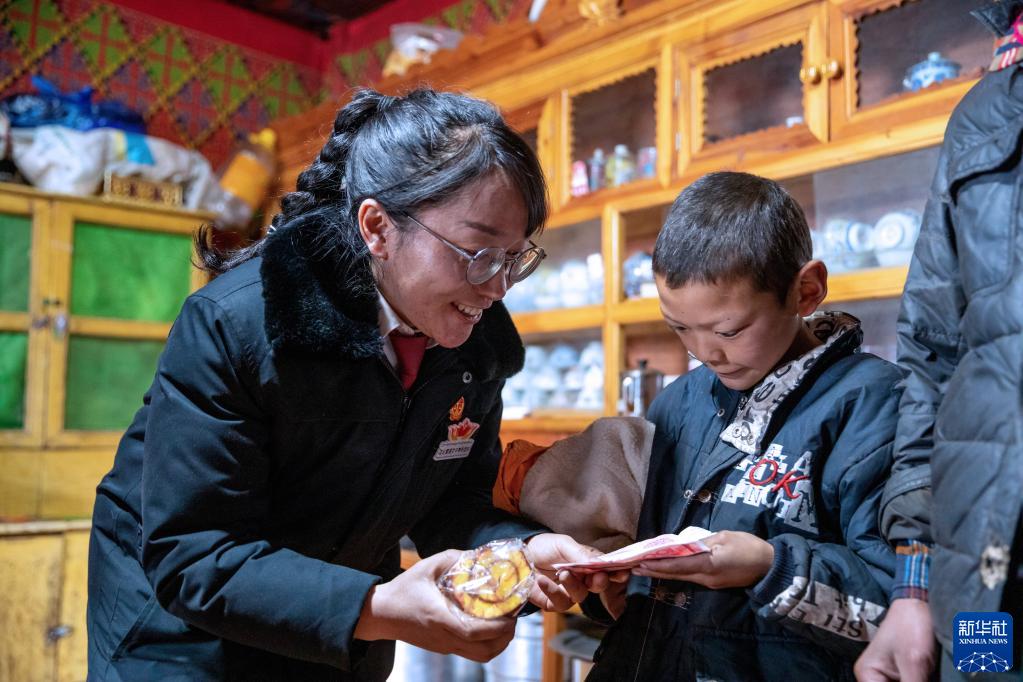 “正義雪蓮”女子審判團(tuán)隊(duì)成員到一名當(dāng)事人家中回訪,法官澤仁曲西(左)為當(dāng)事人的孩子送上助學(xué)金(1月11日攝)。新華社記者 沈伯韓 攝