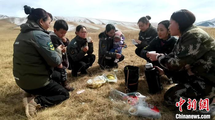 在巡護(hù)了一大片林地后,大家聚到一起休息。草原上席地而坐,背著11個(gè)月大女兒的索南吉放下孩子,小扎西拿著風(fēng)鈴逗著妹妹。一壺清茶、一袋干糧、兩個(gè)孩子,一群女子交流著巡護(hù)情況,不時(shí)也會傳出開心的笑聲。
