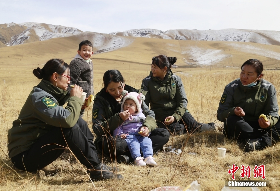 3月17日,位于祁連山腹地的青海省海北藏族自治州祁連縣,女子管護隊員們帶著孩子在草場上休息。因丈夫外出務(wù)工,女子管護隊員將沒有到入學(xué)年齡的孩子帶在身邊工作。 中新社記者 馬銘言 攝