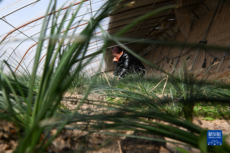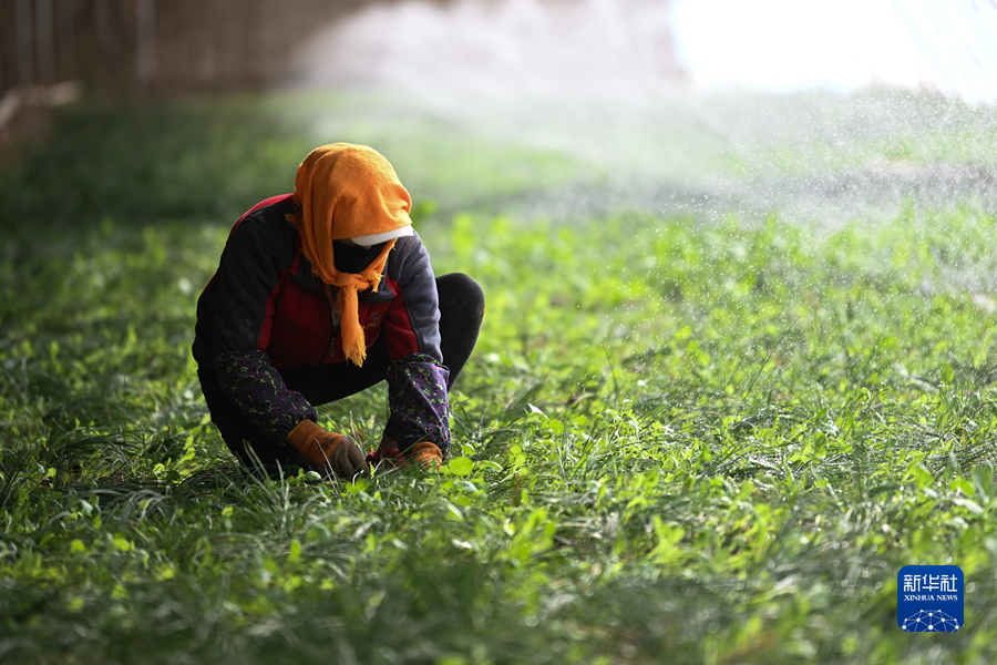 3月23日,藥農(nóng)在青海省海西蒙古族藏族自治州德令哈市柯魯柯鎮(zhèn)的藏紅花大棚內(nèi)除草。新華社記者 王浡 攝
