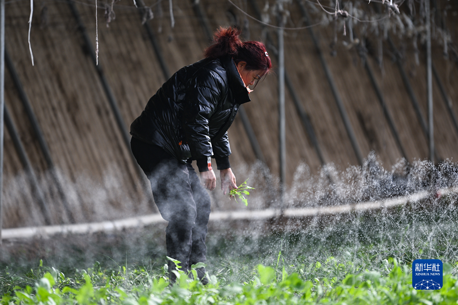 3月23日,藥農(nóng)在青海省海西蒙古族藏族自治州德令哈市柯魯柯鎮(zhèn)的藏紅花大棚內(nèi)查看澆水情況。新華社記者 王浡 攝