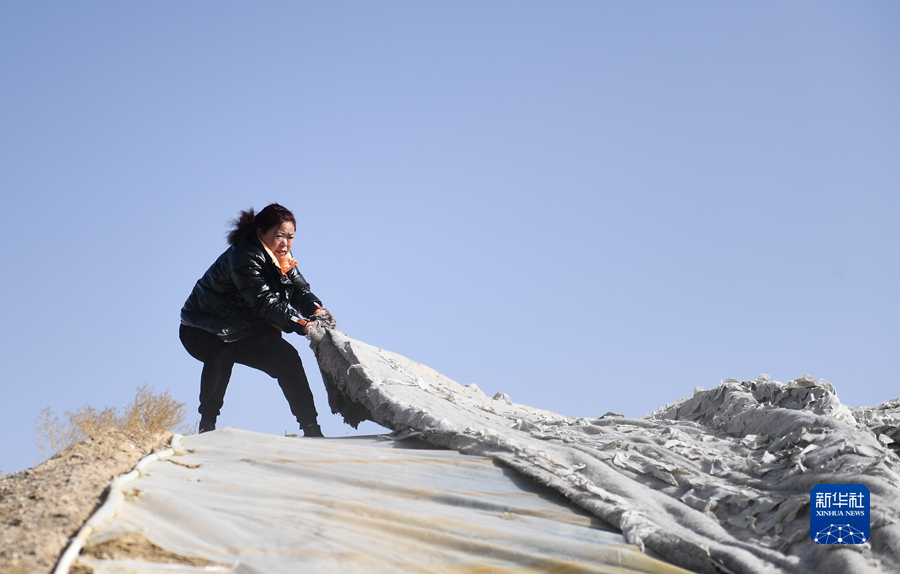 3月23日,藥農(nóng)在青海省海西蒙古族藏族自治州德令哈市柯魯柯鎮(zhèn)整理藏紅花大棚上的保溫棉被。新華社記者 王浡 攝