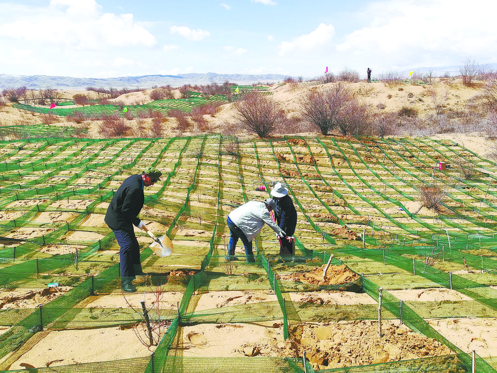 陶銳說:“比如在流動半流動沙丘,我們將工程固沙與生物治沙相結(jié)合。在迎風(fēng)面設(shè)置1.5m×1.5m的草方格沙障,在設(shè)置好的草方格沙障內(nèi)栽植青楊,進(jìn)行烏柳插桿并點播檸條沙蒿等,而在背風(fēng)坡實行插桿造林。在丘間地,我們則采取植苗造林,栽植烏柳苗和沙棘苗,并用網(wǎng)圍欄進(jìn)行封育等?!?/p>