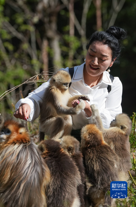 4月26日,在四川白河國家級自然保護區(qū)里,工作人員與川金絲猴在一起。新華社記者 江宏景 攝