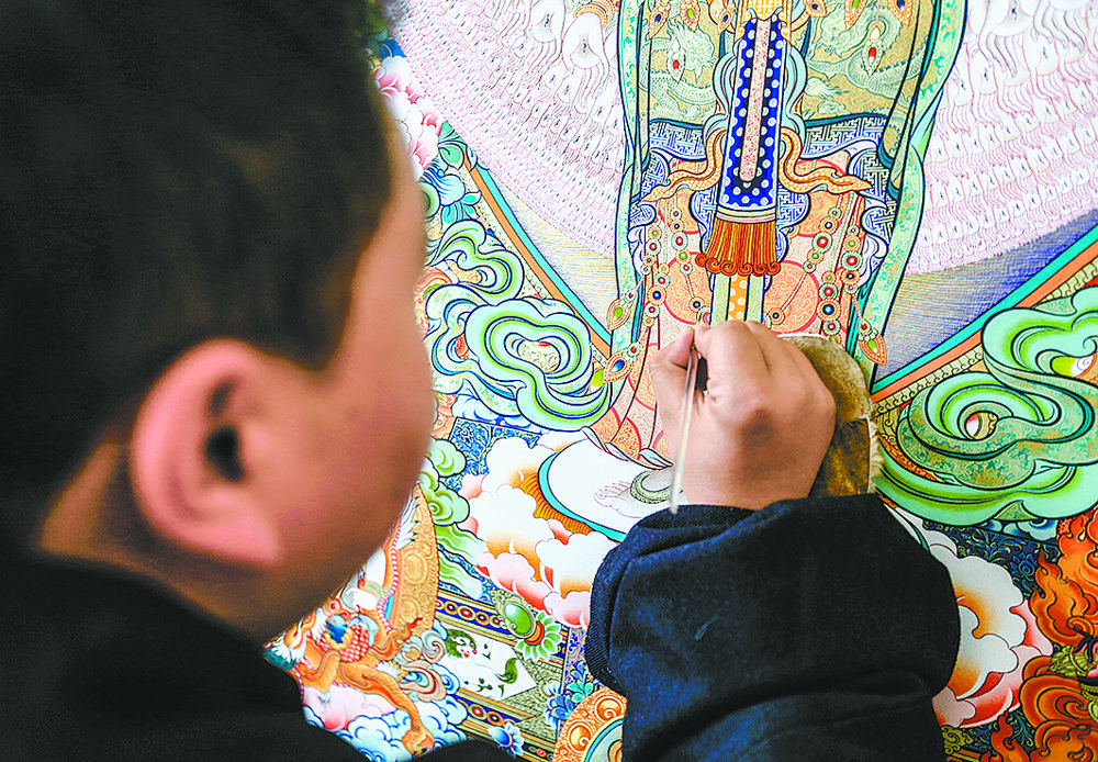 “唐卡”,被譽為世界上最繁瑣的工筆畫,圖為熱貢畫師繪制唐卡局部。