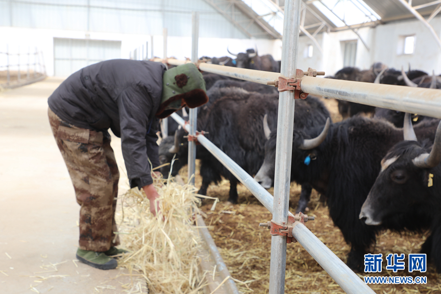 在天峻縣陽(yáng)康鄉(xiāng)牦牛核心群培育基地內(nèi),工作人員在給牦牛投放飼草。新華網(wǎng) 吳婷婷 攝