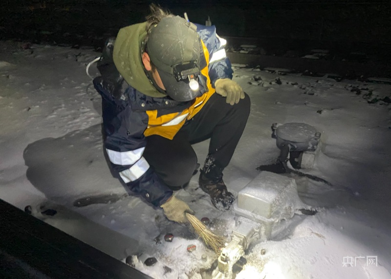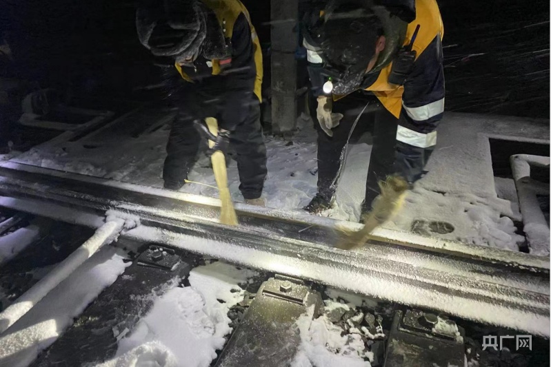 深夜風(fēng)雪中,清掃道岔滑床板。央廣網(wǎng)發(fā) 余國(guó)棟 攝