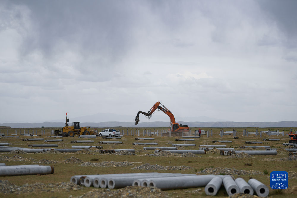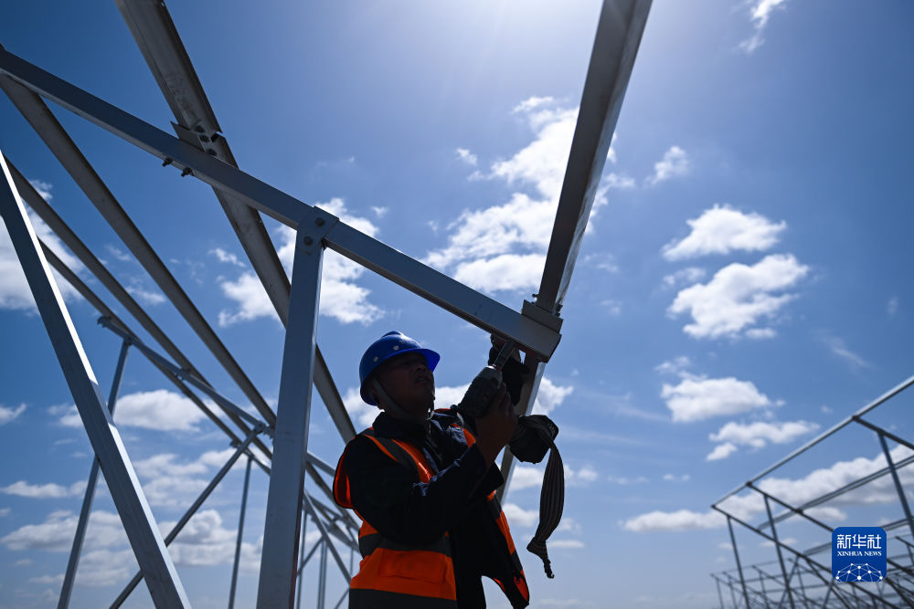 6月8日,工人在國家能源集團(tuán)海南基地共和縣100萬千瓦牧光儲二期20萬千瓦建設(shè)項(xiàng)目施工。新華社記者 張龍 攝