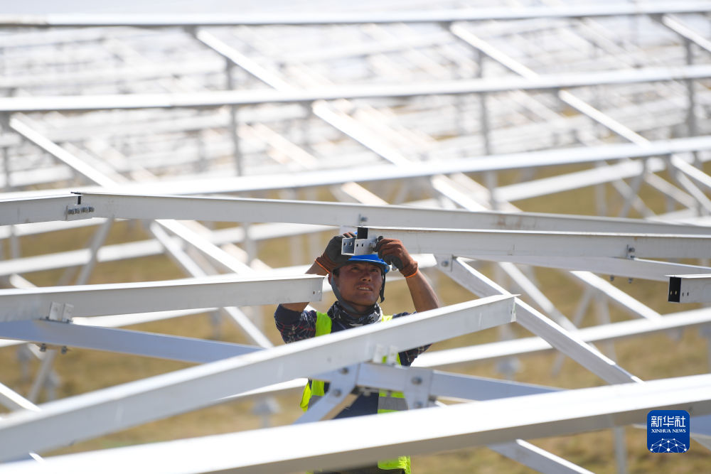 6月8日,工人在黃河上游水電開發(fā)有限責(zé)任公司海南基地共和縣100萬千瓦光伏項(xiàng)目現(xiàn)場施工。新華社記者 駱曉飛 攝