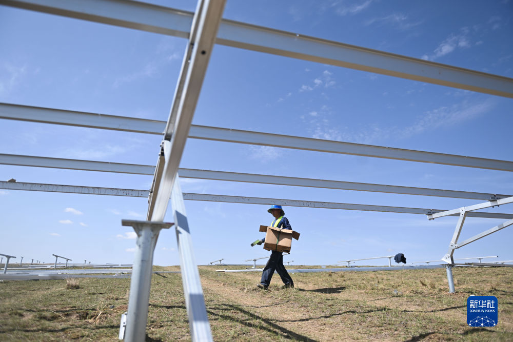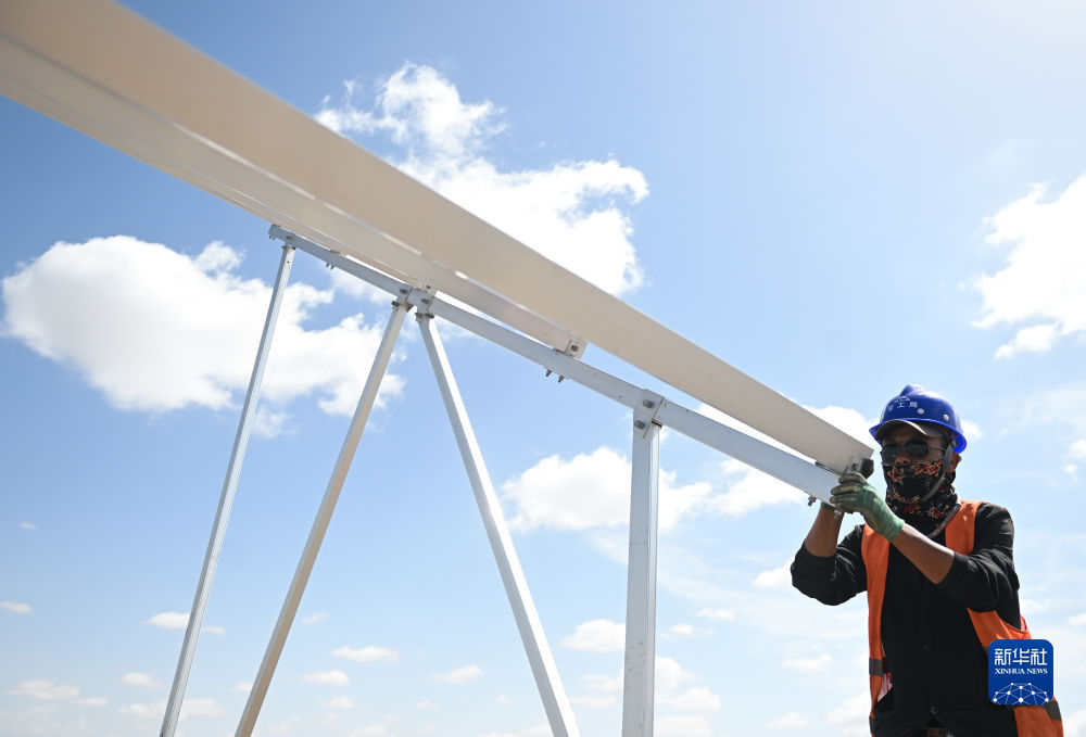 6月8日,工人在黃河上游水電開發(fā)有限責(zé)任公司海南基地共和縣100萬千瓦光伏項(xiàng)目施工。新華社記者 周盛盛 攝