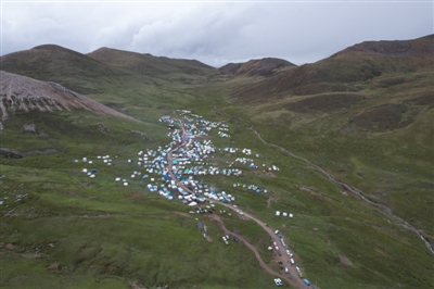 理塘縣共有8個(gè)蟲草產(chǎn)區(qū),阿加溝最大。這片山谷基礎(chǔ)設(shè)施已經(jīng)“不錯(cuò)”,營地道路水泥硬化,兩條土公路修上了海拔5000米的山里。蟲草“淘金者”的主營地在一片開闊的山谷里,三面環(huán)山,山上覆著的一層淺綠的草甸。