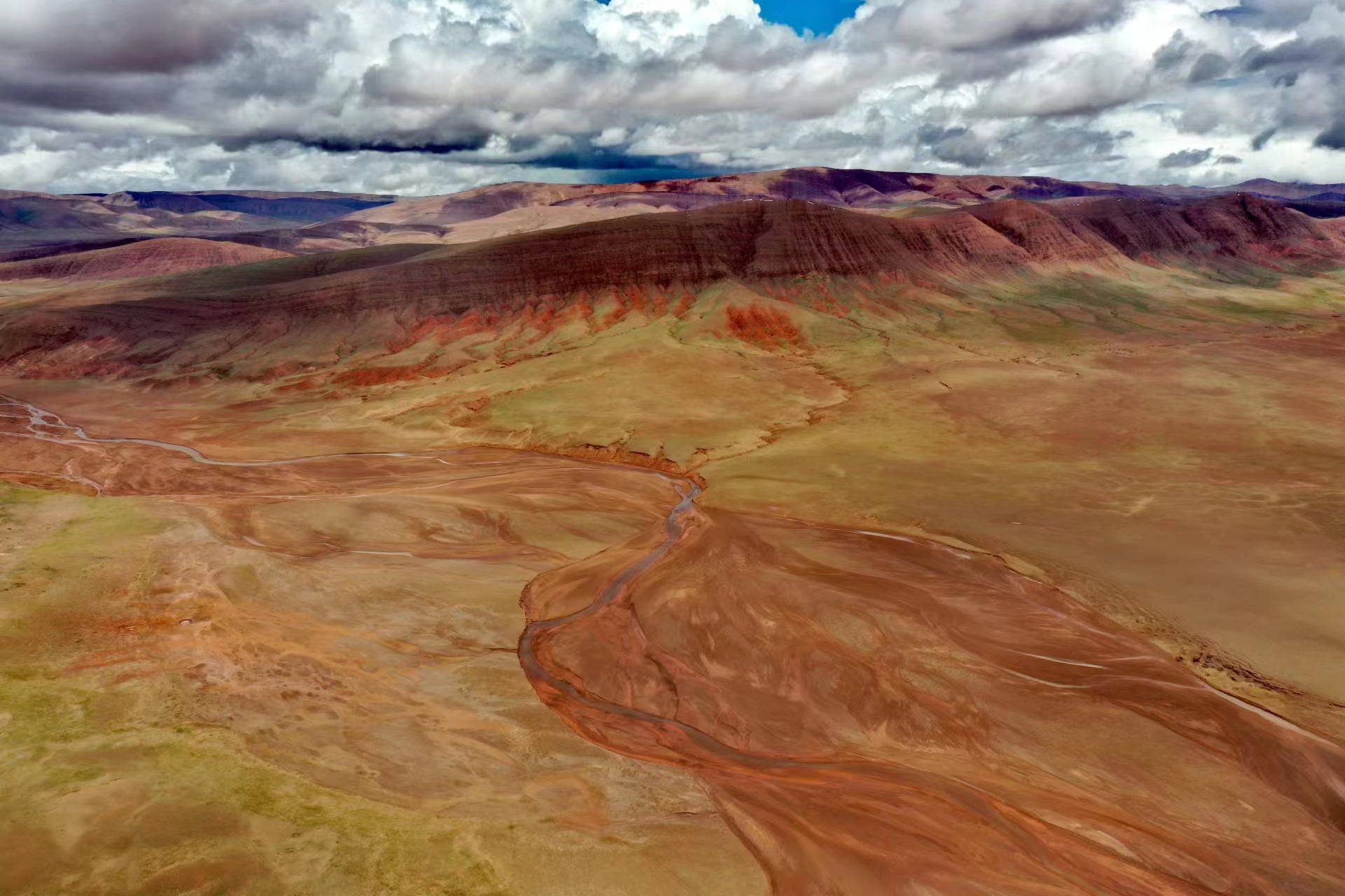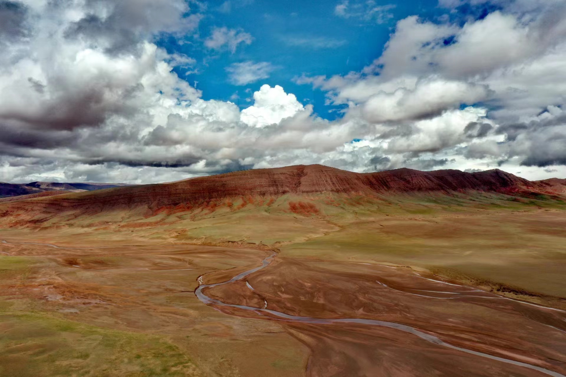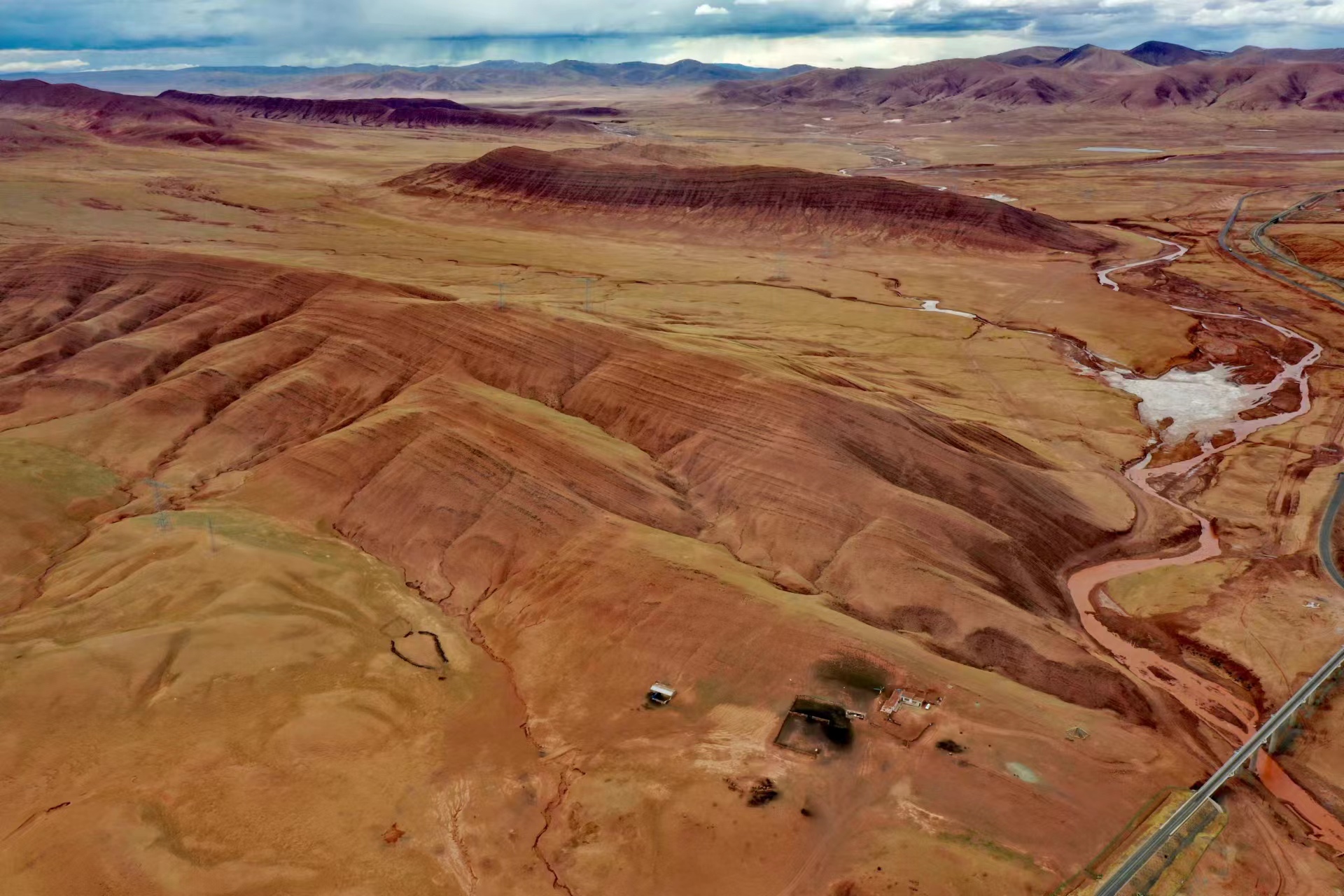 近日,中國地質大學(武漢)長江科考先遣隊員張永一行進行綜合科學考察時,在青藏公路日阿尺曲一帶發(fā)現(xiàn)一條紅色山脈,是青藏高原109國道沿線一處壯觀的地質遺跡。該山脈由晚白堊紀鈣質膠結的粉、細砂巖與古近紀紫紅色、磚紅色復成份礫巖所組成,呈近東西走向,兩坡不對稱,南陡北緩,地層剖面出露清楚。