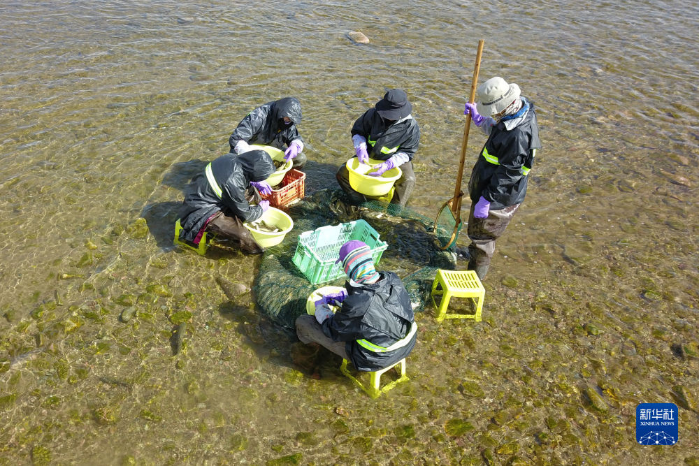 6月29日,在泉吉河河道中,工作人員捕撈親魚(無人機照片)。新華社記者 范培珅 攝