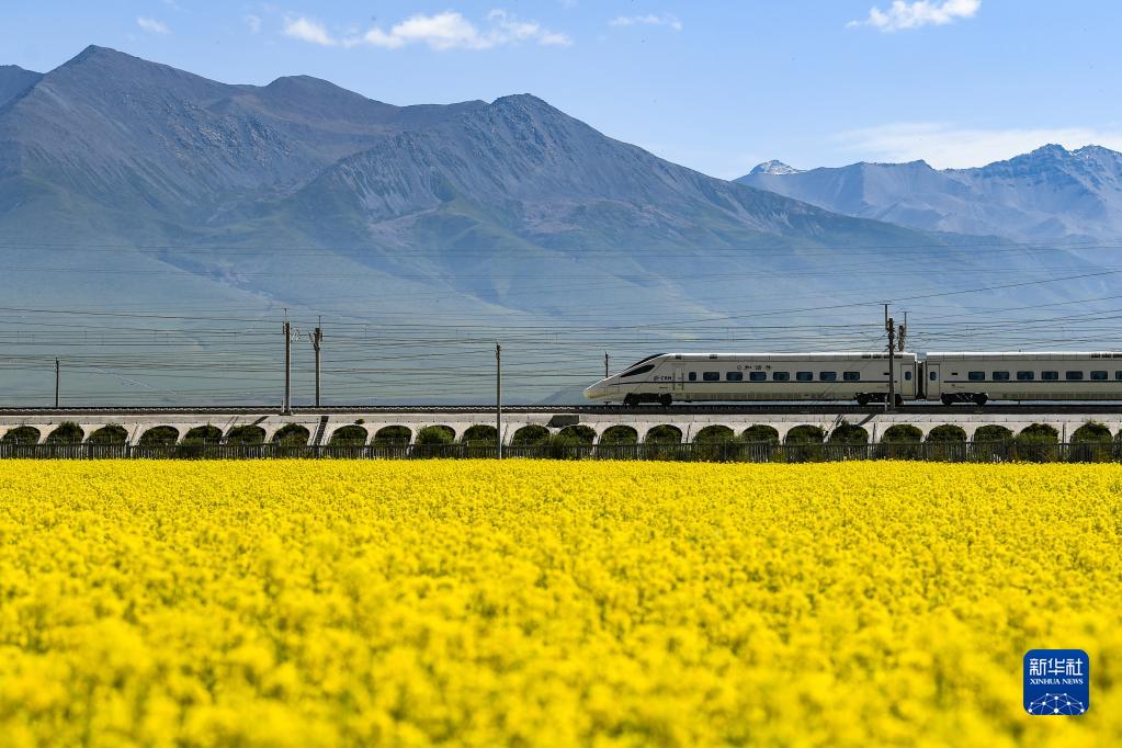 7月3日,列車駛過青海省海北藏族自治州門源回族自治縣境內(nèi)的油菜花田。新華社記者 張龍 攝