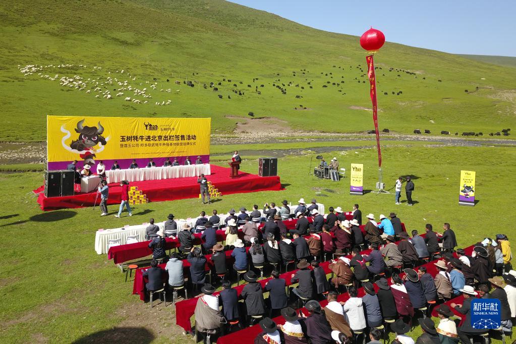 這是7月5日在稱多縣歇武鎮(zhèn)牧業(yè)村拍攝的玉樹牦牛進(jìn)北京出欄簽售活動(dòng)現(xiàn)場(無人機(jī)照片)。新華社記者 范培珅 攝