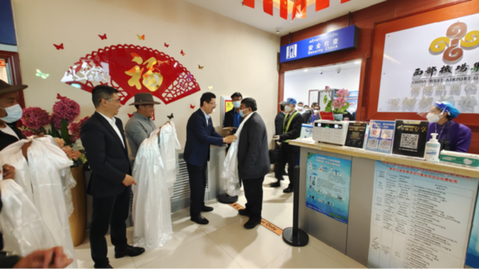 玉樹州委常委、副州長、指揮部黨委書記、指揮袁浩宗,州委常委、組織部長薛亞軍,州委組織部常務(wù)副部長陳有軍,副部長邴巴扎西,副部長、指揮部黨委委員王家兵在機(jī)場大廳迎接,并第一時間為北京市第五批援青干部人才及送行團(tuán)成員獻(xiàn)上了飽含玉樹各族各界干部群眾深情厚誼的哈達(dá),與他們一一握手,向大家的到來表示熱烈的歡迎。