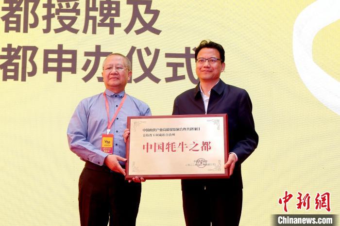 圖為中國(guó)肉類協(xié)會(huì)副會(huì)長(zhǎng)高觀(左)為玉樹州授予“中國(guó)牦牛之都”稱號(hào)。李雋 攝