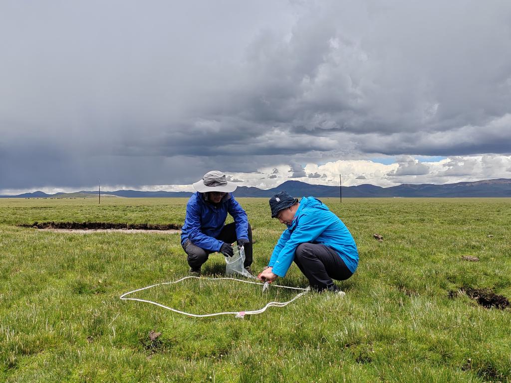7月17日,科考隊員任斐鵬(右)和孫寶洋在觀測自然狀態(tài)下高寒草甸生態(tài)系統(tǒng)狀況。(受訪者供圖)