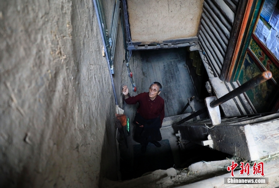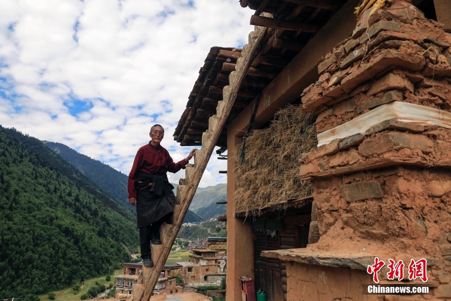 8月17日,日斯?jié)M巴碉房的主人洛吾王爾甲站在木梯上。日斯?jié)M巴碉房坐落于四川省阿壩藏族羌族自治州壤塘縣宗科鄉(xiāng)加斯?jié)M村石波寨,修建于元末明初,距今已有近700年的歷史。碉房共分九層,高25.6米,外型呈階梯狀,是一座保存完好的藏式傳統(tǒng)民居。2006年,日斯?jié)M巴碉房被列為全國重點(diǎn)文物保護(hù)單位。 中新社記者 王磊 攝